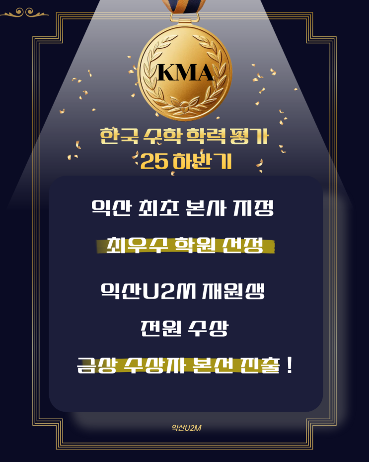 안녕하세요, 익산 유투엠 수학학원입니다. 지난주 열린 KMA 시상에 기분 좋은 소식이 있었습니다. 익산 최초 KMA 본사 지정 최우수 학원 선정 이 타이틀 뒤에는 한계를 넘어선 아이들의 땀방울과 학부모님들의 굳건한 믿음이 있었습니다. 이번 시상식은 끝이 아닌 새로운 시작입니다. 초등 시기의 작은 성공과 좌절, 그리고 스스로 극복해 본 경험은 훗날, 중 • 고등 입시를 버티는 가장 강력한 무기가 될 것입니다. 하반기 KMA 결과 발표! 2025 하반기 KMA 시상식 ♥ 익산 전체 1등인 시장상을 비롯해 국회의원상, 교육장상까지! 단순히 인원만 많은 것이 아니라, 상위권 순위를 유투엠 아이들이 압도적으로 차지하며 실력을 증명했습니다. 영....... <img src="https://blogthumb.pstatic.net/MjAyNTEyMjJfNjMg/MDAxNzY2NDAzMjQzMDAz.uWDqwsFRM7ZNXYU-X0dtK6N_rf9u1x4aXbBrsg7rJgMg.NhPdlYGHksPGOgdJFdqevWB_ZI10iSj5fFDmCHxLPh8g.PNG/25KMA%BD%C7%C0%FB.png?type=s3" />
