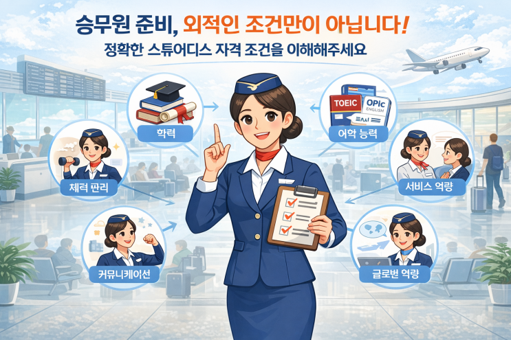 스튜어디스자격조건 무엇이 필요할까? 승무원 준비 전 반드시 알아야 할 기준 항공사 승무원을 꿈꾸는 학생들이 가장 많이 검색하는 정보가 바로 스튜어디스자격조건입니다. 많은 사람들이 키, 외모, 학력 같은 기준만 생각하지만 실제 항공사 채용에서는 다양한 요소가 종합적으로 평가됩니다. 그래서 정확한 스튜어디스자격조건을 이해하고 준비 방향을 잡는 것이 무엇보다 중요합니다. 과거에는 승무원 채용에서 외적인 이미지가 가장 중요한 요소라고 생각하는 경우가 많았습니다. 하지만 최근 항공사 채용 트렌드는 서비스 역량, 커뮤니케이션 능력, 글로벌 역량을 함께 평가하는 방식으로 변화하고 있습니다. 즉 단순히 외적인 조건만 준비....... <img src="https://blogthumb.pstatic.net/MjAyNjAzMDdfMjM1/MDAxNzcyODUyNDA2NDYz.-7z0iWTNWfrK_JUWujg-2c04CVCwqaPxdLGdY4ZCq5Ig.9h7re6GawX12caiUFMstgLWlfZzsGugIa0hL82Dkf4Ag.PNG/%C0%CC%B9%CC%C1%F61.png?type=s3" />
