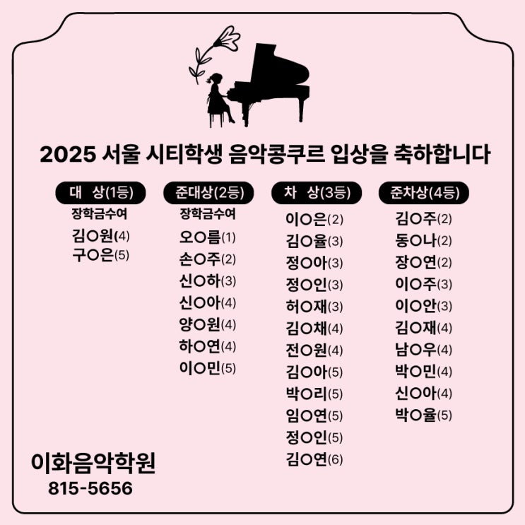 2025 서울 시티학생 음악콩쿠르 입상을 축하합니다 흑석이화음악학원