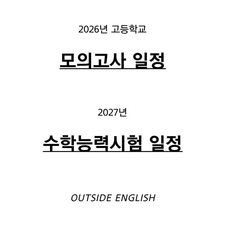 2026년 모의고사 일정 고1 · 고2 (교육청 모의고사) 3월 24일 (화) – 서울시교육청 6월 4일 (목) – 부산시교육청 9월 2일 (수) – 인천시교육청 10월 20일 (화) – 경기도교육청 보통 연 4회 실시됩니다. 고3 (수능 대비 모의고사) 3월 24일 (화) – 서울시교육청 5월 7일 (목) – 경기도교육청 6월 4일 (목) – 평가원 모의평가 7월 8일 (수) – 인천시교육청 9월 2일 (수) – 평가원 모의평가 10월 20일 (화) – 서울시교육청 고3은 수능 제외 총 6번 시험이 있습니다. ✔ 중요한 시험 6월 모의평가 → 수능 출제기관 시험 (난이도 중요) 9월 모의평가 → 실제 수능 난이도 가장 유사 2027 수능 일정 시험일: 2026년 11월 19일 (목....... <img src="https://blogthumb.pstatic.net/MjAyNjAzMTVfMTk1/MDAxNzczNTU4NzE5MjQ1.mEFNt6OceilP0YL0mb_sM-FxlxdDd3_WKSUOwh4fNgsg.7ecdjff8FxQyWTngcsVC-vvOlfOoFADPIuEC5KAQurUg.JPEG/%BF%AD%B8%C5-002_%281%29.jpg?type=s3" />