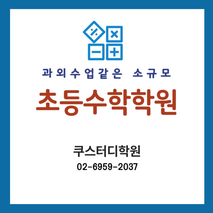 과외처럼 꼼꼼하게! 기초부터 실력까지 잡는 쿠스터디 초등 수학 초등 수학, 제대로 시작하는 것이 중요합니다! 초등 수학은 중·고등 수학까지 이어지는 가장 중요한 기초 단계입니다. 이 시기에 개념을 정확히 이해하지 못하면 이후 학년에서 수학이 점점 어렵게 느껴질 수 있습니다. 초중고 영어·수학 전문 학원 쿠스터디 학원의 초등 수학 수업은 대형 학원의 일방적인 진도식 수업이 아니라 소규모로 진행되는 꼼꼼한 지도를 통해 학생이 개념을 정확히 이해하도록 돕습니다. 소규모 수업으로 부족한 부분을 정확하게 보완 수학은 학생마다 어려워하는 부분이 다릅니다. 어떤 학생은 연산이 약하고, 어떤 학생은 서술형이나 응용 문제에서 막....... <img src="https://blogthumb.pstatic.net/MjAyNjAzMTFfMTI3/MDAxNzczMjI4ODgzNjI1.X1MeEUfX3QODNIs8aAOXUZrPcWsNPBqyIzb9eEODrYog.EK4CKZjrexpHkB9L5eLc0zIjSsL5vIMVB_uRCdho3EEg.JPEG/%C1%A6%B8%F1%C0%BB_%C0%D4%B7%C2%C7%D8%C1%D6%BC%BC%BF%E4_-006.jpg?type=s3" />
