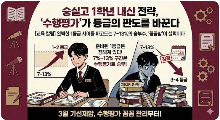 [교육 칼럼] 완벽한 1등급 사이를 파고드는 7~13%의 승부수, '꼼꼼함'이 실력이다 숭실고등학교에 갓 입학한 1학년 학생들과 학부모들에게 3월은 설렘보다 긴장감이 앞서는 시기이다. 특히 내신 등급에 대한 압박이 시작되는 시점에서, 대다수는 지필고사(중간·기말고사) 공부에만 매몰되기 쉽다. 하지만 숭실고 내신 전략의 실질적인 '키(Key)'는 지필고사가 아닌 수행평가에 있다. 1. 1등급은 정해져 있다? 변수는 2~3등급 구간 냉정하게 말해, 중학교 시절부터 완벽하게 준비된 상위 4% 이내의 1등급 학생들은 지필고사에서 큰 실수를 하지 않는다. 그러나 그 바로 뒤를 잇는 **7%에서 13% 사이의 학생들(2~3등급 구간)**....... <img src="https://blogthumb.pstatic.net/MjAyNjAzMDJfMTE3/MDAxNzcyNDE0Mzc3MzM5.2tKJdjbiehH_q4lFGvKOjsxpRNMfp_VPyVnjQOkzbrQg.ZHRPRyA7xaH8mBE8gFY7Uodra3dHTh8ttxE3AZf3sw4g.PNG/image.png?type=s3" />