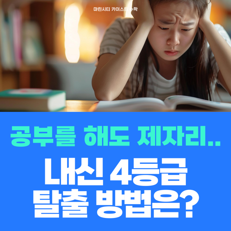 내신 4등급 정체기에서 탈출하는 법 안녕하세요. 마린시티 중고등 수학 학원! 카이스트수학입니다. "공부를 안 하는 것도 아닌데 성적이 오르지 않아요." 4등급에 머무는 학생들의 고민입니다. 개념 수업도 듣고 문제집도 여러 권 풀어보지만, 정작 시험장에서는 아는 문제조차 헷갈리거나 조금만 응용되어도 손을 대지 못하는 상황이 반복되곤 합니다. 이는 단순히 노력이 부족해서가 아니라, 본인이 알고 있다고 믿는 개념 속에 숨겨진 오개념들이 성취의 발목을 잡고 있기 때문입니다. ❌ 실제로 4등급 학생들에게 보여지는 잘못된 공부법이 몇 가지 있는데요. 오늘은 그 부분을 함께 살펴보겠습니다. 수학 4등급에서 벗어나지....... <img src="https://blogthumb.pstatic.net/MjAyNjAyMTlfMTg0/MDAxNzcxNDc1OTIxNzQ1.huSimKp_YWgkvJYJP6vFszUSaJB23Gl0sBfEWYiJRNYg.yHehosJq-2FWj5olOZ-3yqc-f8RMIdv32kbTee9TpJog.PNG/76.png?type=s3" />