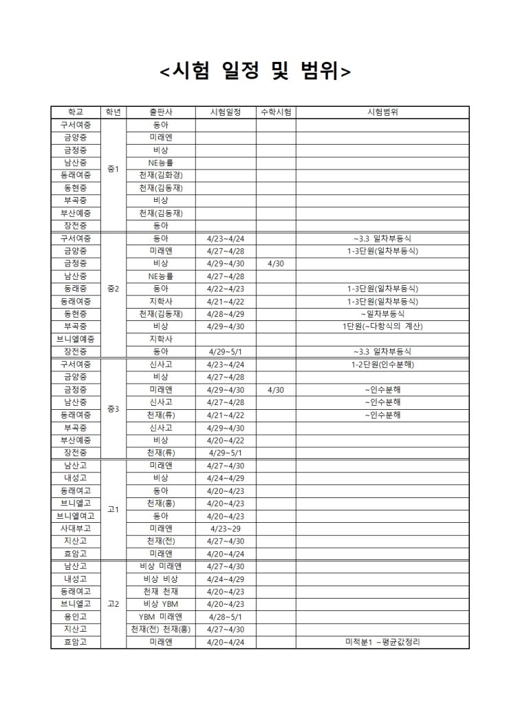 금정구 중학교 고등학교 중간고사일정 <더매쓰>