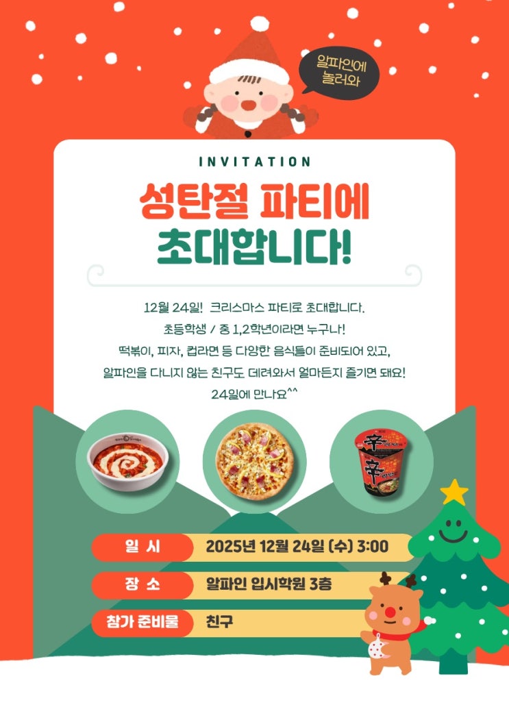 안녕하세요, 알파인 입시학원입니다. 지난 12월 24일 크리스마스 이브, 우리 학원에서는 평소의 엄격한 공부 분위기 대신 아이들의 웃음소리와 활기찬 에너지로 가득 찼습니다. 이번 크리스마스 파티는 본원 재원생뿐만 아니라 외부 학생들도 참여할 수 있도록 문을 열어두었는데, 예상보다 훨씬 많은 학생이 방문하여 함께 시간을 보냈습니다. 단순한 '놀이' 그 이상의 의미가 있었던 그날의 기록을 공유하며, 알파인 입시학원이 지향하는 교육의 본질에 대해 말씀드리고자 합니다. 아이들에게 필요한 것은 '숨 쉴 수 있는 공간' 이번 파티에 기대 이상의 많은 학생이 몰려서 무엇 때문일까 고민해보았습니다. 요즘 아이들....... <img src="https://blogthumb.pstatic.net/MjAyNjAxMDNfMTU5/MDAxNzY3NDE5NjAzMzk0.Yfed4r5eBY_lbCBhWzkfiAYyBaYmxFFJ8FhKC4fMEf8g.t2ocobobDksPcuWo0l9uxzb4DtMUUB5oYohJs6SijlEg.JPEG/KakaoTalk_20260103_144820480.jpg?type=s3" />