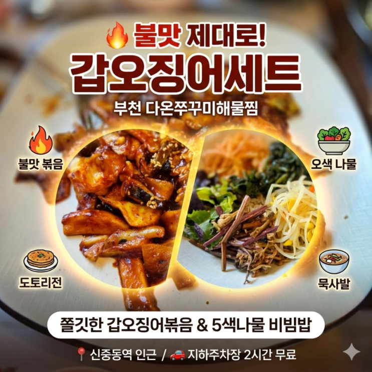 안녕하세요! 오늘은 부천 신중동역 근처에서 제대로 된 '불맛'을 느낄 수 있는 다온쭈꾸미해물찜 갑오징어세트 소개합니다. 쫄깃한 식감의 끝판왕, 갑오징어 세트의 구성부터 맛까지 하나하나 소개해 드릴게요! 위치 및 주차 정보 위치: 신중동역 롯데백화점 인근 (접근성 아주 좋아요!) 주차: 건물 지하주차장 2시간 무료 이용 가능 (차 가지고 오셔도 주차 걱정 NO!) 세련되고 넓은 내부 분위기 매장에 들어서자마자 깔끔하고 넓은 인테리어가 눈에 띕니다. 돌벽을 활용한 포인트 인테리어와 고급스러운 조명이 더해져 가족 외식이나 단체 모임을 하기에도 손색없는 분위기예요. 오늘의 메인: 갑오징어 세트 구성 이....... <img src="https://blogthumb.pstatic.net/MjAyNjAzMTBfNjcg/MDAxNzczMTQ2NjIzODU4.bVtzt_gcE6SXek7sc_WQRh6NOr7ljsYYiJDkjFZrVZwg.hfLPZR7RW2Sa7Z5NeaVPrevs5Aw44qT8s3K55siFzyIg.PNG/900%A3%DF1773145508139.png?type=s3" />