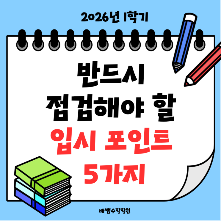 안녕하세요. 관평동 배쌤수학학원 입니다. 새 학년을 맞이한 지금 시기는 학생과 학부모님 모두가 지금 방향이 맞는지를 가장 고민하는 시점입니다. 입시는 단기간의 노력보다 교육과정 구조와 평가 방식에 맞는 준비가 이루어졌는지가 결과에 더 큰 영향을 줍니다! 그래서 오늘은, 새 학년을 맞이하면서 반드시 점검해야 할 입시 포인트를 입시 구조와 평가 기준을 바탕으로 정리해 보겠습니다. 1. 현재 성적이 어떤 방식으로 만들어진 결과인지 점검해야 합니다. 성적을 평가할 때 중요한 것은 점수 자체보다 그 성적이 유지되는 방식입니다. 개념 이해를 바탕으로 해결이 이루어지고 있는지 아니면 반복 학습으로 특정 유형에 익숙해진 결과인....... <img src="https://blogthumb.pstatic.net/MjAyNjAzMTRfOCAg/MDAxNzczNDU3ODUxMTg2.qIS5DHS8nw0hPkG7myKD5iIYEvnuijUr4qtDToNb5LEg.HL7LJtPqvTa-Funls92igwa-l3T7GJiyGBvb8rSp24Ig.PNG/%C0%D4%BD%C3%C6%F7%C0%CE%C6%AE_5%B0%A1%C1%F6.png?type=s3" />