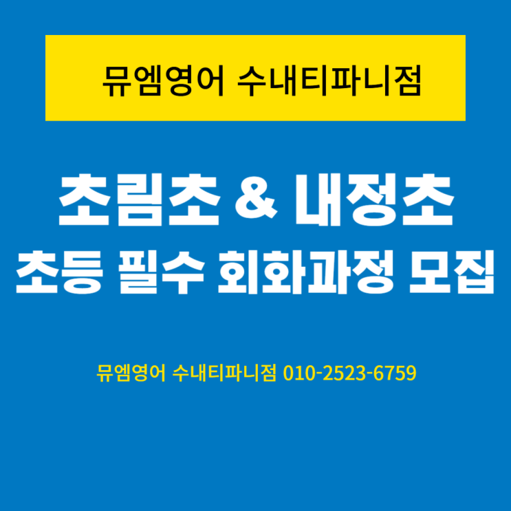 이제 새학기 시작과 함께, 특히 초등 1학년에 입학시킨 어머님들은 우리 아이가 얼마나 학교과정에 잘 적응할 수 있을지, 또, 어떻게 우리 아이를 도와줄 수 있는지 고민이 많으실꺼예요. 이번에, 뮤엠영어 수내티파니점에서 White C1,C2, C3 (3개월 과정)으로 모집하고 있어요. 초등 필수 회화 표현을 마스터하게 도와주는 과정이예요. 뮤엠영어 White C 과정 교육부 지정 초등 필수 회화 표현을 중심으로, 영어 문장 사용 경험을 키워주는 회화 과정입니다. White C 과정의 특징(3개월 과정) 1) 초등 회화 표현 120개 학습 2) 영어 문장 발화연습 약 1,600회 3) 실생활의 다양한 상황 학습 4) 흥미있는 3,000컷 이미지 활용 5) 1,800가지 실제....... <img src="https://blogthumb.pstatic.net/MjAyNjAzMTNfOTkg/MDAxNzczMzc1NDgzNDAz.M4vXsb6jpjKEHXOeRrR9omgRe2Nrktk_o3QUsQpHXmAg.9jpFW6HbLhRxpEzOiWs_fOlv4q2asux7xGG6Q6nDPfgg.PNG/%C1%A6%B8%F1%C0%BB_%C0%D4%B7%C2%C7%D8%C1%D6%BC%BC%BF%E4_-001_%281%29.png?type=s3" />