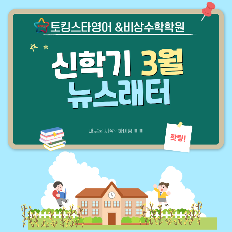 안녕하세요!!! 비전동 덕동초등학교 영어 수학학원 토킹스타&비상수학 원장 리더윤 서윤주 원장입니다!!. 매년 맞이하는 3월 이지만, 올해는 유독 제 마음이 더 설레는데요!! 긴 겨울방학의 정적을 깨고 다시 활기로 가득 찰 학교가 기대되면서 '새학기'라는 거대한 파도를 마주할 우리 아이들의 긴장되고 설레는 모습이 벌써부터 눈에 보이네요^^ 우리 토킹스타&비상수학의 3월 소식!!! 꼭 읽어 보세요!! 1. 3월 학부모님이 꼭! 알아야 할 점! 2. 3월 학원 맞춤형 시간표 안내 3. 3월 휴원일 안내 4. 서술형 영작 수업 3월, ‘속도’를 줄여야 ‘완주’할 수 있습니다 많은 부모님이 3월이 되면 마음이 급해지십니다. &q....... <img src="https://blogthumb.pstatic.net/MjAyNjAzMDJfNTkg/MDAxNzcyNDUyMDY4MDM5.4n2oXulYWpWzYr7XTbmD3EIrLfTTVwLPGxBVQOOTZkAg.ZyXUSMVGGOc2OmkQeqnM3OSNbMzY9Z-PWj5dwQ3KB7Mg.PNG/1.png?type=s3" />