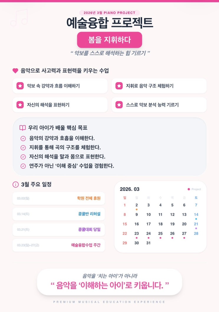 더라엘음악학원 “예슐융합 이해중심” 수업 안내 피아노는 많이 배우지만, ‘음악을 이해하는 법’을 배우는 수업은 많지 않습니다. 일반적인 피아노 수업이 ✔ 음을 정확히 치는 것 ✔ 빠르게 완성하는 것 ✔ 시험을 준비하는 것 에 초점이 맞춰져 있다면, 더라엘은 다르게 접근합니다. 우리는 아이에게 묻습니다. “왜 이 부분은 여리게 연주할까?” “이 곡의 흐름은 어디로 향하고 있을까?” 이번 3월 프로젝트에서 아이들은 ✔ 지휘를 통해 음악의 구조를 몸으로 이해하고 ✔ 악보 속 강약과 흐름을 스스로 발견하며 ✔ 자신의 해석을 말과 연주로 표현합니다. 단순히 치는 아이가 아니라, 스스로 읽고 생각하고 해석하는 아이 ✨ 이것이 더....... <img src="https://blogthumb.pstatic.net/MjAyNjAzMDFfNjUg/MDAxNzcyMjk2NzMzMjk0.qUd47CkKHXpzbrHN8wkXaJCFrcMRyFeRxMS8hhAW3LIg.X41QixbqnHWD_PsKbDaJMWpKKjyPZMUq8mE7MxIPOkQg.JPEG/IMG%A3%DF0886.jpg?type=s3" />