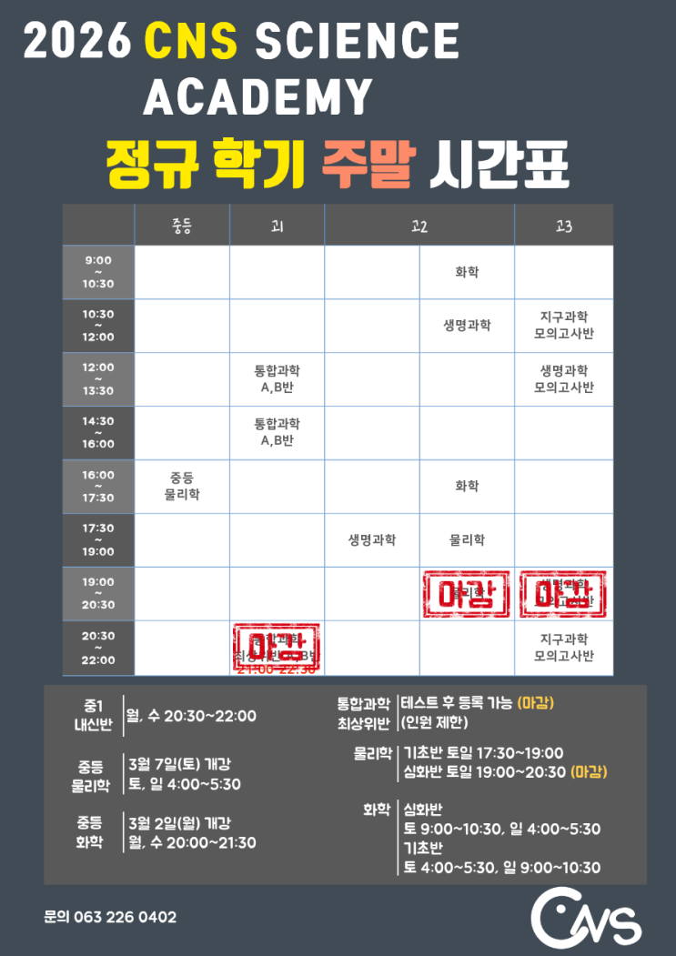 CNS 과학학원입니다. 2026년 정규 학기 시간표 입니다. <img src="https://blogthumb.pstatic.net/MjAyNjAyMjhfMjE1/MDAxNzcyMjc5NzY2NTY2.fmxxtcrwKLTcBoY39fEOzeX65epm6m_n2ErUbMrZg08g.v3PBVmtVSnRC-BqjmDS7om042yGW-gs_PnzMbudyRA4g.PNG/2026_%C1%A4%B1%D4_%C1%D6%B8%BB%BD%C3%B0%A3%C7%A5.png?type=s3" />