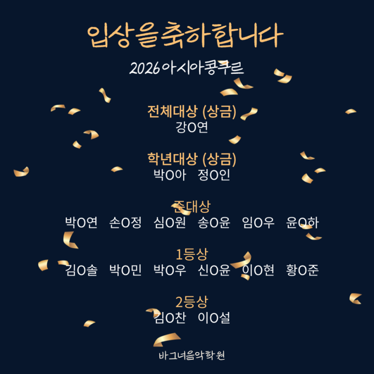 #창원대방동음악학원 #창원대방동피아노 #창원대방동피아노학원 #창원신대방동피아노학원 #창원신대방동피아노학원추천 #창원신대방동음악학원추천 #창원신대방동피아노전문 #창원신대방동유아피아노 #창원대방동초등피아노 #창원성주동음악학원추천 #창원성주동피아노학원 #창원성주동성인피아노 바그너 콩쿨반 친구들의 전원입상을 축하합니다 경연을 준비하는 과정에서 다양한 경험을 하고 감정을 느끼며 성장한 바그너 친구들 무대에 올라 떨림을 견디고 경연을 마친 바그너음악학원 친구들이 자랑스럽습니다 :) 3개월간의 아이들의 노력이 결실을 맺은 날 경연에 참가한다는 결정부터 멋진 도전이였는데, 엄청난 결과까지 안겨준 바....... <img src="https://blogthumb.pstatic.net/MjAyNjAzMTBfNDAg/MDAxNzczMTQ4MzcxODU2.OM3ugMq_gm0Q9Nxp0gGjUvR1A2XvkZrmtFCw0AeYSFAg.UjuoMrdOedE1ImxLr-TxYc-1bovqfXjKMRHNmJPYVQog.PNG/IMG%A3%DF3905.PNG?type=s3" />