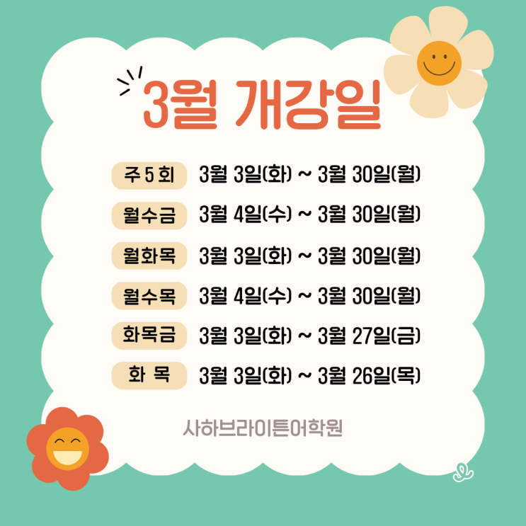 사하브라이튼어학원 2026년 3월 개강 안내문입니다. ⭐ 저희 학원의 개강일과 종강일은 주5회는 20회, 주3회는 12회, 주 2회는 8회 수업을 원칙으로 이루어집니다. 2026년 1학기가 시작되는 3월, 사하브라이튼에서 처음 공부를 시작하는 친구들을 맞이하는 달이죠? 올해도 모든 친구들 우리 선생님들과 함께 즐거운 수업을 해봅시다! 그리고 중등은 4월에 있을 중간 고사 시험 준비를 시작합니다. ✍ 첫 스타트를 끊는 하단중학교 학생들은 3월 19일(목)부터 한달 간 시험대비를 시작합니다. 이후에 다른 중학교 학생들의 시험 준비 일정도 알려드리겠습니다. 우리 선생님들과 부모님들의 응원을 받으면서 공부를 해볼....... <img src="https://blogthumb.pstatic.net/MjAyNjAzMTlfMjYw/MDAxNzczOTE5MTcxMjgz.izqaRLVkMcnufldIRrvYI1KxLhgFLdufck3SPRMo-xwg.zPVf3_mACZ3tOQ3wwFj1_deyhHHm0Q3s7bZtHjuosmEg.PNG/3%BF%F9_%B0%B3%B0%AD%BE%C8%B3%BB%B9%AE.png?type=s3" />