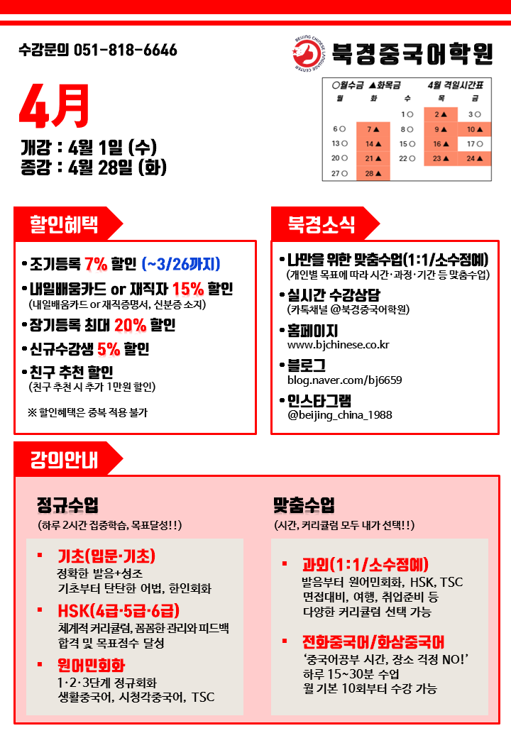 4월 개강 및 할인혜택 4월 시간표 4월 시간표 ▲ 4월 주5일/격일시간표 학원, 수업에 대한 문의사항은 051-818-6646 또는 카카오톡 채널로 연락 주세요 :) ▼ 카카오톡 채널 <img src="https://blogthumb.pstatic.net/MjAyNjAzMjBfMjIg/MDAxNzczOTgwNjcwNzkx.Jq7br6fTi3vW2bASlpbciyLZaDgytJ35ubO5TYFQRpgg.df_P7RuEzmDHl9o3DwTh2IwnxNtAM15BZlrvgOlUWuIg.PNG/001_26%27_4%BF%F9_%C8%AB%BA%B8%A1%DA.png?type=s3" />