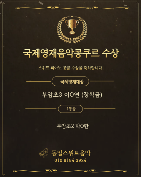 안녕하세요! 아이들의 꿈을 키워 나가는 따뜻한 예술공간 부암동스위트피아노입니다. 오늘은 우리 스위트피아노 친구들의 콩쿨 수상 소식을 가지고 왔어요. 이번 저희학원에서는 2월말에 열린 국제영재음악콩쿠르에 참가해 멋진 경험을 했답니다. 2월말이 콩쿨시즌이라 참가자가 너무 많아 현장에서 좀 걱정을 했지만 우리 친구들이 열심히 연습해서 준비한만큼 멋진 모습을 보여줘서 좋은 성적을 거두었습니다. 먼저 국제영재대상을 수상한 부암초 3학년 친구의 콩쿨당시 영상입니다! 처음으로 콩쿨을 나갔는데 3학년 학생들중 최상위권을 해서 장학금과 서울연주 기회까지 얻은 우리 서O이 너무 기특하고 멋졌습니다. 다음으로는 1등상을 수상....... <img src="https://blogthumb.pstatic.net/MjAyNjAzMjFfMTg5/MDAxNzc0MDgwNzEzNDI1.Gu496DNCwN9A_c6ki8RVLHIm05LiwQAam6IX52uXJgkg.FKxc3tLFGKjjNPDjDsC0DexV74zXZXL98GTYObC_FGAg.PNG/%C4%E1%C4%F0_%BC%F6%BB%F3_%C4%B8%C3%C4%BA%BB.png?type=s3" />