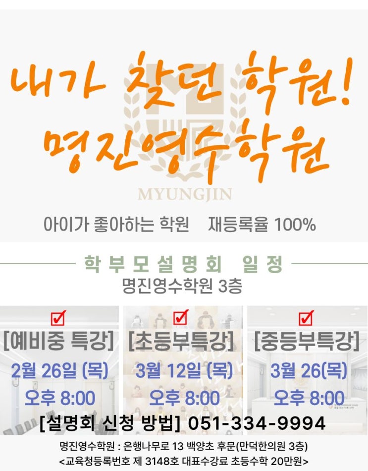 안녕하세요. 만덕 명진영수학원입니다! 저희가 매달 진행하는 초등부 / 중등부 학부모님 대상 설명회를 진행하고 있는데요. 항상 바쁜 시간들을 내시어 방문해 주시고 좋은 강의와 정말 필요한 꿀 정보를 듣고 배워가셨습니다! *명진영수학원이 드리는 작은 선물은 덤 설명회 후기 매달 많은 설명회를 하고 있지만, 다양한 주제와 초등부 맞춤 / 중등부 / 고등부 맞춤 특강을 진행하다 보니 많은 학부모님이 귀하신 시간을 내어 와주고 계십니다. 아직 만덕에서 설명회를 한 번도 듣지 않으셨다면? 명진영수학원 ✅ 아이가 좋아하는 학원 ✅ 내가 찾던 학원 ✅ 1호점 기준 재등록률 100% (26. 01월 기준) 다른 설명회 일정이 궁금하시다면, 아....... <img src="https://blogthumb.pstatic.net/MjAyNjAyMjVfNzIg/MDAxNzcxOTk0OTE3MTg2.x0CB7wxh2GTzKWmvgctVFX1HlsUx3Gxy33vGJ11RYIEg.Gq8nHIroePPeBdUz5y4olyyuGKGayDej8SwRp92jK7Qg.JPEG/%C1%A6%B8%F1%C0%BB_%C0%D4%B7%C2%C7%D8%C1%D6%BC%BC%BF%E4._%284%29.jpg?type=s3" />
