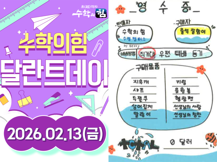 우리 아이들의 웃음이 가득가득했던 달란트데이 성실하게 쌓아온 노력의 결과를 즐거움으로 보상 받는 동기부여 시간이였습니다❤ 수학의힘 달란트데이 대성공 즐거운 분위기 속에서 자신감이 더욱 생길 수 있도록 작은 동기부여로 큰 성장을 만들 수 있도록 우리아이들을 응원하겠습니다 <교육문의> 051)904-1015 010-4732-1014 (전화/문자 모두 가능합니다) <img src="https://blogthumb.pstatic.net/MjAyNjAyMjVfOTMg/MDAxNzcxOTk5ODgwNTc4.TYg196WYzXUzvlc-WG6t1jkBjGi8gwKNUDX9B6hfpKEg.2URrZlBwgxDkDbQWxwcOuDosXEwjWq4za8biVaN_tWAg.PNG/BeautyPlus-Collage-2026-02-25T05_42_16.png?type=s3" />