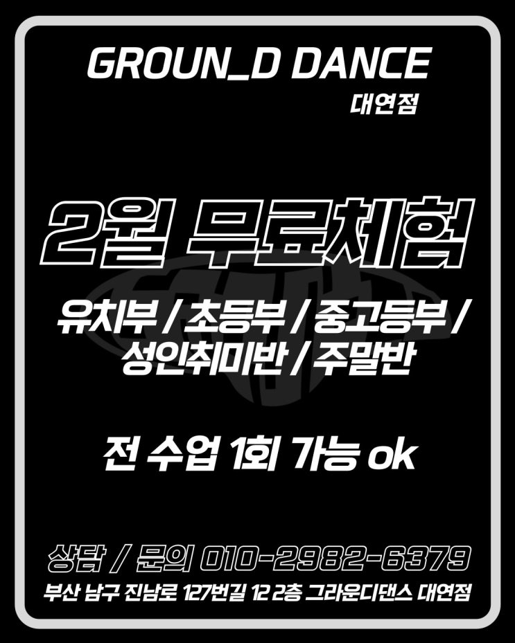 안녕하세요!!! #부산댄스학원 #대연동댄스학원 #경성대댄스학원 그라운디댄스 대연점 입니다 안녕하세요, 키즈 전문 그라운디댄스 대연점입니다! 학교 끝나고 딱 좋은 시간! 초등 저학년 친구들을 위한 신규 방송댄스 취미반이 개설되었습니다. ✅ 초등 저학년(1~3학년) 주 2회 취미반 ✅ 수업 요일: 화요일 / 목요일 ✅ 수업 시간: 오후 2시 10분 집 앞까지 안전하게! 차량 운행도 그라운디가 책임집니다! 차량 운행 문의가 많아 조기 마감될 수 있으니 서둘러주세요! 차량 운행 안내 학부모님들께서 가장 많이 문의하시는 차량! 아래 지역 등·하원 차량 운행 가능합니다. 대연동/대연혁신 용호동 메트로시티 문현동(성동초 주....... <img src="https://blogthumb.pstatic.net/MjAyNjAxMzFfMjA1/MDAxNzY5ODU0NzUwOTIz.xRjGTYaF7Pd9xZFhncO5nblkdRYTwVvhJA-o2-BknAQg.aC0cG7CVREOmNWQqiQ9S8paLY1dga-fNVt2_jmu_Hiwg.JPEG/%C1%A6%B8%F1%C0%BB-%C0%D4%B7%C2%C7%D8%C1%D6%BC%BC%BF%E4_-050_%283%29.jpg?type=s3" />