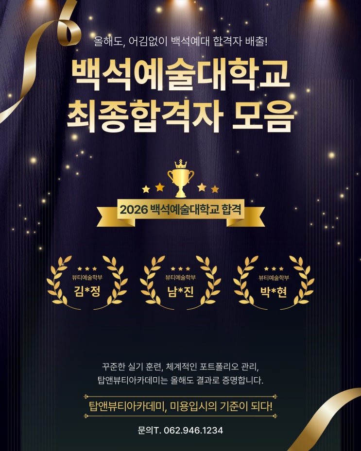 안녕하세요! 탑앤뷰티아카데미입니다. #광주미용학원 #수완지구미용학원 입시 이야기를 하면 많은 학생들이 먼저 이렇게 생각합니다. “입시반을 꼭 들어야 하나요?” “지금 수업으로는 대학 합격이 어렵지 않을까요?” 하지만 실제 결과는 꼭 그렇지만은 않습니다. 광주미용학원 수완지구미용학원 탑앤뷰티아카데미에서는 별도의 백석대 입시반을 운영하지 않았음에도, 일반 수업을 듣던 학생들이 백석대학교 미용학과 최종 합격이라는 의미 있는 결과를 만들어냈습니다. 합격한 학생들, 특별한 수업을 듣지 않았습니다 백석대학교에 합격한 학생들은 ✔ 입시반이 아닌 일반 과정 수업을 수강했고 ✔ 처음부터 백석대를 목표로 시작한 것도 아....... <img src="https://blogthumb.pstatic.net/MjAyNTEyMjJfMTA0/MDAxNzY2MzcwNDAzNjQw.OaT2Q2TKky07SFkY10wUP4ay_zA4oAfD8Fuf9Ui-FDog.GzhF1IN37OjDxOzkZ6qzs43S5OokvJw_6wJm10DIcIQg.JPEG/26%C7%D0%B3%E2%B5%B5%B9%E9%BC%AE%C7%D5%B0%DD_%282%29.jpg?type=s3" />