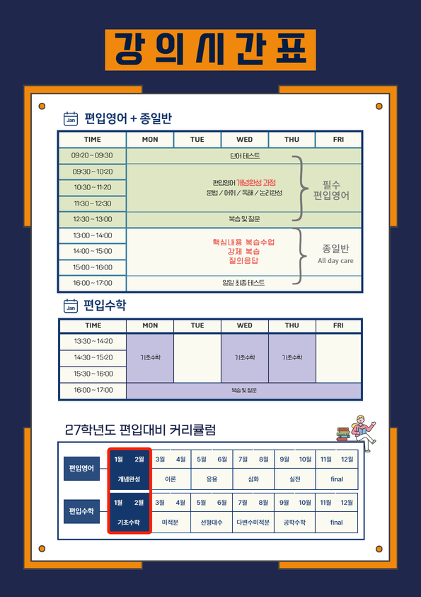 27년대비 ) 김영편입 광주캠퍼스 26년1월 강의시간표 안녕하세요 김영편입 광주캠퍼스 입니다 :) 광주캠퍼스 26대비 편입생들이 이제 시험을 보러 다니고 있답니다 ! 곧 경희대, 건국대를 앞두고 마지막까지 스피드를 내고 있는 우리 #김영편입광주캠퍼스 원장님도 교수님도 모두 긴장모드! 모두들 원하는 대학에 합격해서 1월2월에는 합격증으로 도배를 해보도록 하겠습니다 ! (바램) ㅋㅎ 이제 이렇게 26대비 학생들도 끝마무리중이면서~ 27대비 학생들 문의가 많이 오고잇는데요 !! 이제 또 우리 새로운 김영편입 광주캠퍼스 1월 강의시간표가 오픈 했습니다 27년 대비 1월 종합반 개강안내 인문, 경상계열 지원시 편입영어 자연, 공과계열 지....... <img src="https://blogthumb.pstatic.net/MjAyNTEyMjJfMTk1/MDAxNzY2MzY1ODYzOTA4.HXKMNH_5380HBMejchJGPRD6JyPpy-3OVFSfBbHzP4cg.PvMvwuJSbr6pOwxXXG4Xf8MOFRC7Aw7DSJKXk6ug6gUg.PNG/26.01_%BD%C3%B0%A3%C7%A5_%2827%B4%EB%BA%F1%29_1.png?type=s3" />