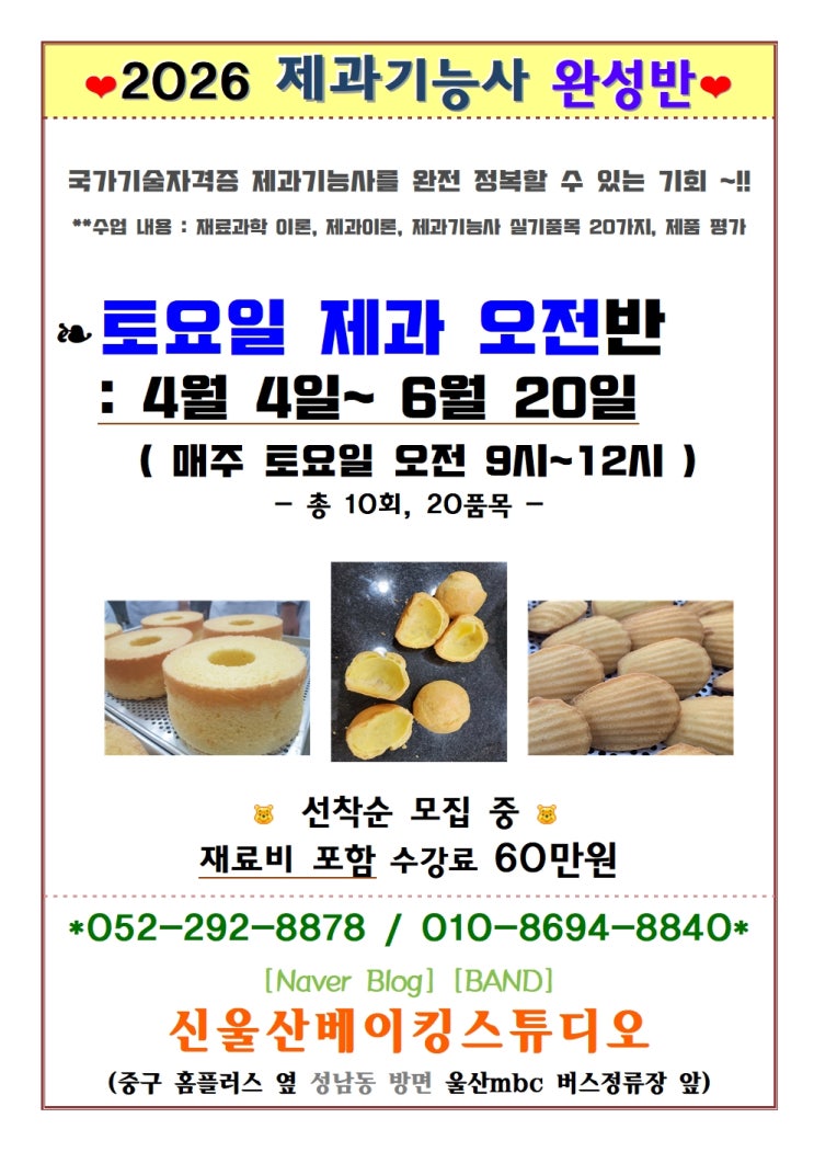 #제과제빵 #제과기능사 #제빵기능사 #케이크디자이너 #학생자격증 #학생제과제빵 #직장인자격증 #직장인제과제빵 #제과자격증 #제빵자격증 #국가기술자격증 #산업인력관리공단 #큐넷 #국가인정자격증 #주말반 #토요반 #단기특강반 모집 #제과기능사 #제과기능사완성반 제과기능사 국가기술자격증 취득 주말반 일정; 2026년 4월 4일~6월20일 (매주토요일) *5월2일, 6월6일 제외 시간; 오전 9시~12시 수강료; 재료비포함 60만원 교육내용; 제과 20종 실기, 재료과학&제과 이론, 제품 평가 신울산베이킹스튜디오 052-292-8878 중구 홈플러스에서 mbc사거리 방면 아이스킹 건물 4층 #울산단체베이킹체험 #울산베이킹수업 #울산제....... <img src="https://blogthumb.pstatic.net/MjAyNjAyMjZfODkg/MDAxNzcyMDcxMTE3NTU4.GEVkAC_TCKfGBTBqs6c5Xw0cE7rqVaEXS2qmryYOyP4g.4-EOF99YqRegDRIIxuETIakMufHS4pGRgTrKHCC0U5kg.JPEG/%C0%DA%B0%DD%C1%F5_%C6%AF%B0%AD%B8%F0%C1%FD_%BA%AE%BA%B8%BF%EB_24.12.30001.jpg?type=s3" />