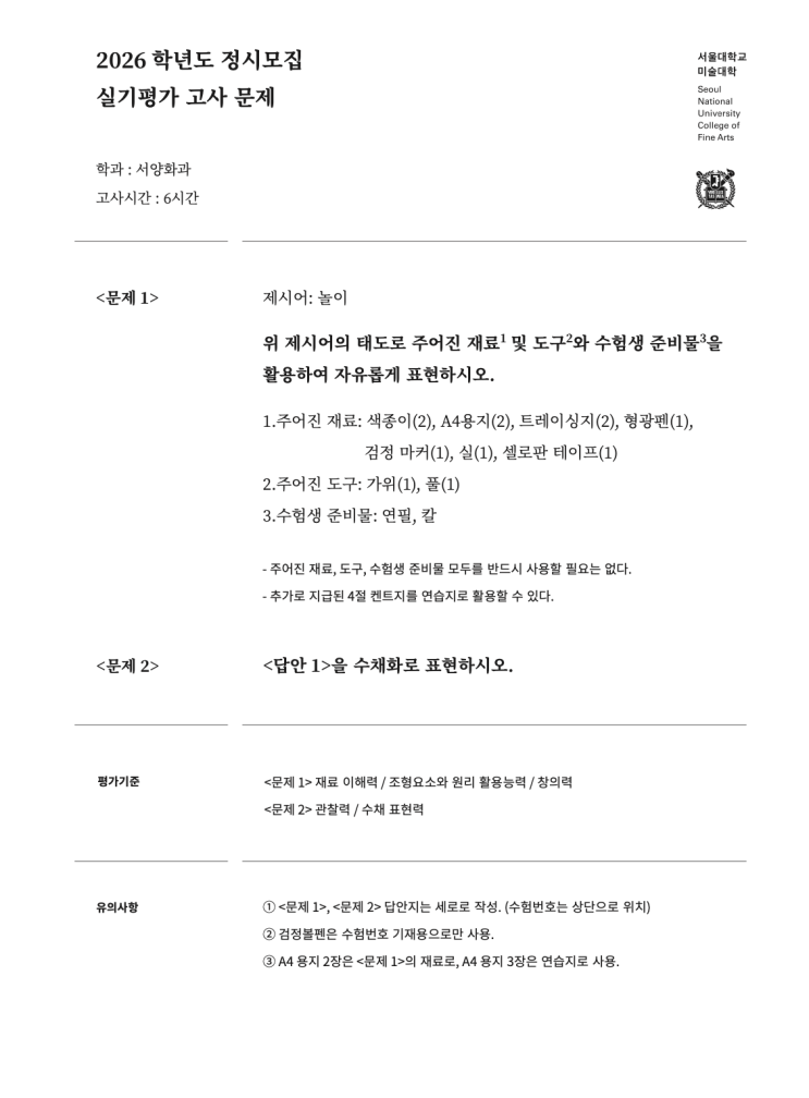 안녕하세요, 수원•동탄에 위치한 입시미술학원 아트한 입니다. 저희학원에서는 현재 기초소양실기를 지향하는 학교를 목표로 하는 학생들을 대상으로 하는 입시반이 운영중입니다. 그 중에서도 서울대학교와 이화여대 그리고 국민대와 같은 세 학교에서 주로 출제되는 문제는 기초소양실기의 평가 항목에 속합니다. 그 안에서도 문제 별 특징과 기출 유형은 상이하지만, 기본적으로 기초소양실기는 주어진 대상의 특징을 이해하고 창의적으로 재해석하는 것을 보며, 이를 통해 학생의 '사고력과 표현력'을 종합적으로 평가하는 것입니다. 이러한 사고력과 표현력의 종합적인 평가 항목 아래, 문제가 어떻게 출제되는지, 그리고 앞서 말....... <img src="https://blogthumb.pstatic.net/MjAyNjAyMjFfMTM3/MDAxNzcxNjY3NTMwNjcx.n73a7tmRKCaQ6WIEE7x0qxcj5YKLMO0kwfA7XE6J-M4g.MbXsAHkIzRnIIiI04aTxVELrDrxB7etosw4S8sISEg4g.PNG/%BD%BA%C5%A9%B8%B0%BC%A6_2026-02-20_%BF%C0%C8%C4_6.50.26.png?type=s3" />