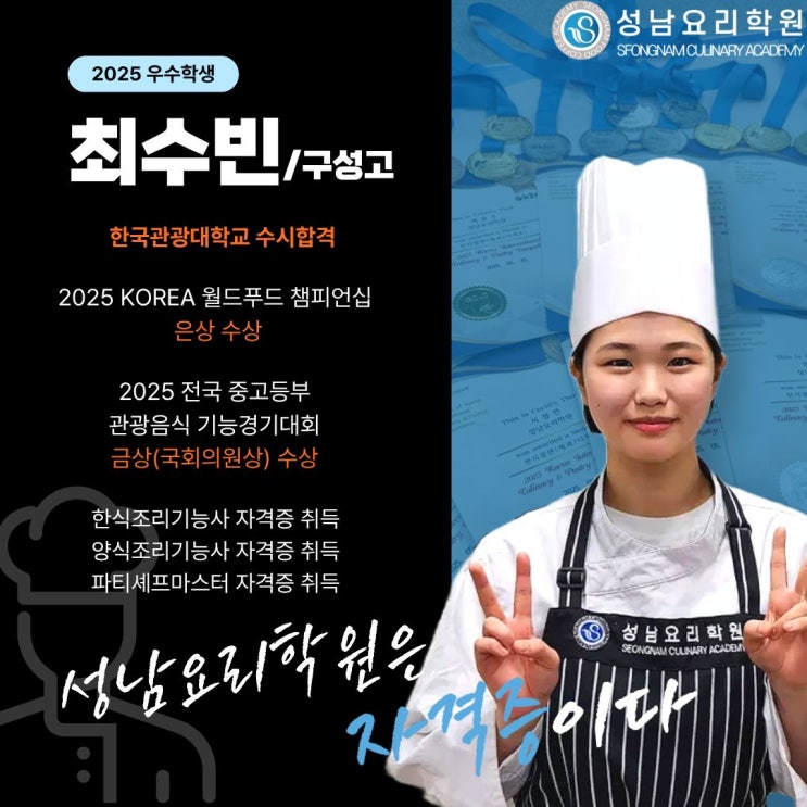 2025 일반고 특화훈련 과정의 졸업을 앞두고 성남요리학원에서는 한 해 동안 성실하게 수업에 임하며 성장해 온 학생들의 인터뷰를 차례로 전하고 있습니다. 이번 인터뷰의 주인공은 수업에서 가장 높은 집중력을 보이며 친구들과 선생님을 성실하게 도와 지난 학기 선행부문 표창장을 받았던 최수빈 학생의 이야기입니다. Q. 요리에 관심을 갖게 된 계기가 있다면? 좋아하는 연예인이 요리에 관심이 많아서 본받고자 시작하게 되었습니다. 특히 메모하는 습관, 일기 쓰기, 운동하기 등 철저한 자기 관리를 하는 모습이 멋지게 느껴졌고 저도 그런 태도를 닮고 싶어 노력하고 있습니다. Q. 성남요리학원에 오게 된 이유? 친구의 소개로 성남요리....... <img src="https://blogthumb.pstatic.net/MjAyNTEyMTVfMTgz/MDAxNzY1Nzg3ODc3NDY1.hMgPUwDnGhmLiX3tHQXgHLqIwPfXuQj8WjEMW1ZO2rIg.GG5BR40MzNKNNtpVMGV9ySX3N-YVhRMEpw1c-kyoS40g.JPEG/%C0%A7%C5%B9%C0%CE%C5%CD%BA%E4_%2813%29.jpg?type=s3" />