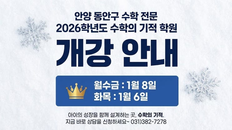 "우리 아이 진도, 이대로 괜찮을까?" 불안을 확신으로 바꾸는 곳. 평촌 수학의 기적 안녕하세요. 수학의 기적 학원입니다. 어느덧 2025년의 끝자락, 그리고 2026년 새 학년을 준비해야 할 가장 중요한 시기인 겨울방학이 다가왔습니다. 이맘때가 되면 학부모님들의 상담 문의가 빗발칩니다. 고민은 모두 비슷합니다. "원장님, 옆집 아이는 벌써 고등 수학 들어갔다는데, 우리 애만 늦은 거 아닐까요?"“ 중학교, 고등학교 올라가는데 지금 이 성적으로 괜찮을까요?" 불안한 마음에 남들 다 하는 '빠른 진도'에 아이를 내몰고 계시진 않나요? 하지만 수학의 기적은 단호하게 말씀드립니다. "중요한 것은....... <img src="https://blogthumb.pstatic.net/MjAyNTEyMjJfMjU3/MDAxNzY2MzY5NDkzMDI1.owkmQz9gTJYQkjJ9x23UCUH576I7RS7AxKQuO7UEaJcg.47Dws21hJAFutX26XjlcdcPk-SE-b3G3JuvUVJFrWJEg.JPEG/%BC%F6%C7%D0%C0%C7%B1%E2%C0%FB_%B0%B3%B0%AD.jpeg?type=s3" />