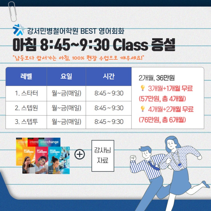 안녕하세요, 강서민병철어학원입니다! ♂️ 매번 "영어 공부 해야지..." 결심만 하고 포기하셨나요? 인강은 완강하기 어렵고, 화상영어나 전화영어는 항상 하는 말만 하다가 끝나고 .... 짧은 대화로 끝나 아쉬움이 남으셨을 거예요. 진짜 실력을 키우고 싶다면? 100% 현장 수업이 정답입니다! 여러분의 '갓생'을 지원하기 위해 강서민병철이 준비한 특별한 소식을 전해드려요. ☀️ 아침을 깨우는 45분의 기적! [아침 8:45 클래스 증설] 바쁜 일과가 시작되기 전, 딱 45분만 투자해 보세요. 남들보다 앞서가는 아침을 위해 오전 8시 45분 타임을 전격 오픈했습니다! 시간: 아침 08:45 ~ 09:30 (월~금 매일) 대상: 출....... <img src="https://blogthumb.pstatic.net/MjAyNjAzMjBfNjQg/MDAxNzc0MDE3NTk1MzQ0.WcckrfPsX8hGUbo9eRw7aTKVUmzTI4gUKHBHdXrzDPkg.xAlsgS6hkiUh6ZDDwViARs6k0RL_aaBieUbreNqyTm0g.JPEG/%C1%A4%B1%D4%BF%B5%BE%EE%C8%B8%C8%AD_845.jpg?type=s3" />