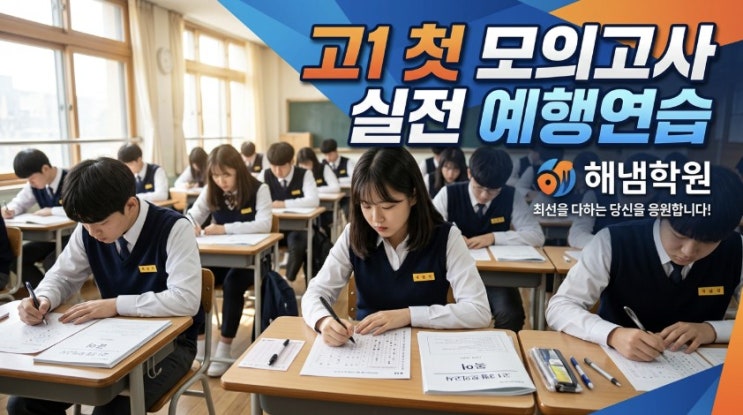 "나 진짜 고등학생 됐구나…" 입학한 지 얼마 안 된 것 같은데, 벌써 코앞으로 다가온 3월 21일 고1 첫 모의고사. 동인천고, 숭덕여고 친구들은 지금 어떤 마음인가요? 설레는 마음 반, 걱정되는 마음 반이죠? 특히 중학교 시험만 보다가 처음으로 맞이하는 고등학교 모의고사는 규모 자체가 다릅니다. 오전 9시부터 오후 4시 30분까지, 무려 7시간 이상 진행되는 이 시험은 단순한 '지식 테스트'가 아닙니다. 집중력, 체력, 시간 관리, 그리고 멘탈까지 모두 요구하는 종합 실전 훈련이죠. 그래서 오늘은 해냄학원이 준비한 고1 첫 모의고사 실전 예행연습에 대해 자세히 소개해 드릴게요! 고1 첫 모의고사, 왜 이렇게....... <img src="https://blogthumb.pstatic.net/MjAyNjAzMTlfMjA3/MDAxNzczOTI1MTMxMDQ5.o6QvAVIU9slJS_NgTMIF01u_YDoRuDdZ-NnWVikOpOUg.nHlURTdujmF0o6aatl_qz_iLOX89TMWcvPAYW62Wk6og.JPEG/%BD%E6%B3%D7%C0%CF-2026.03.19.jpg?type=s3" />
