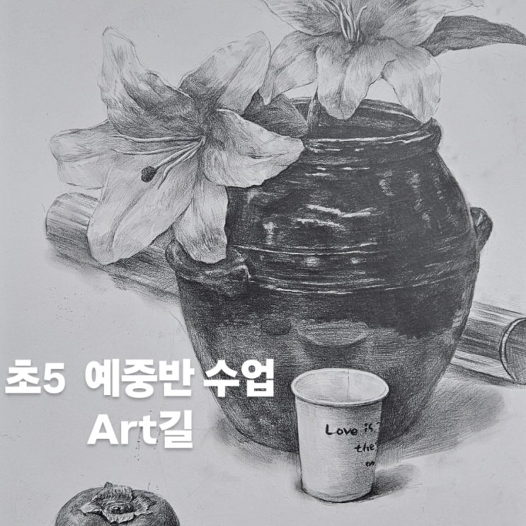 원장 직강, 오늘도 알뜰하게 초등 5학년 예중 입시반, 오늘도 연필을 깎으며 수업을 시작했다. 백합부터 짚고 넘어간다. "꺾이는 부분, 여기가 포인트야. 이 각도가 입체감을 만들어. " 조화지만 표면의 잔주름까지 놓치지 않는다. 연필 터치 하나하나가 꽃잎의 결을 살린다. 항아리의 깊은 고유색, 그 옆 종이컵의 밝은 톤. "이 대비를 보라고. 명암의 폭이 그림에 힘을 준다." 감은 자연물이라 질감이 다르다. 부드럽게, 둥글게. 껍질의 미묘한 표면 처리까지 세심하게 짚어준다. 그리고 항아리 표면에 비치는 종이컵. "반사되는 이미지의 질감도 달라. 항아리 표면을 타고 흐르듯 표현해야지." 한 명 한 명 옆....... <img src="https://blogthumb.pstatic.net/MjAyNTEyMTlfMjU2/MDAxNzY2MTU1NjQ0ODE0.vOUvK9G5cjQwDdb9eA4oSfAzFTPOM7qDazUftX10wtog.pz9jssUqCe1XN972R_MD3XczUULJ9DFC3e2JwUmpsWQg.JPEG/900%A3%DFIMG%A3%DF20251219%A3%DF221924%A3%DF139.jpg?type=s3" />
