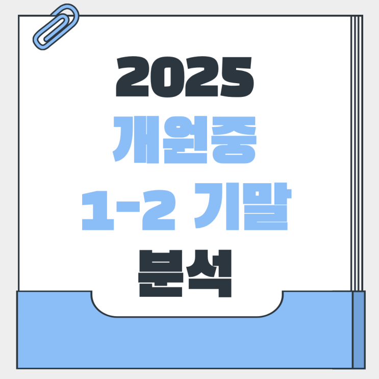 안녕하세요, 이해국어학원입니다. 오늘은 개원중학교 1학년 2학기 기말고사를 분석해드리려고 합니다. 1. 총평 - 개원중학교는 <보기>에서 적절한 것을 모두 고른 선지를 선택하는 문제가 종종 출제되기 때문에, 개념을 꼼꼼히 학습해야 <보기>의 선지를 골라낼 수 있습니다. 품사와 소설의 기본 개념부터 응용 문제풀이까지 꼼꼼히 공부하고 시험장에 들어갈 수 있도록 했습니다. 2. 시험범위 - 객관식 100%로, 총 27문항 출제되었습니다. 시험범위는 아래와 같습니다. 3. 대비전략 [문법] - 중간고사에 형태소가 시험범위에 포함되었다면, 기말고사엔 품사가 포함되었습니다. 기본 개념을 꼼꼼히 학습하되, 같은 형태지만 형태소가....... <img src="https://blogthumb.pstatic.net/MjAyNTEyMjFfMjEy/MDAxNzY2MjgxNTM1ODI1.MhQzvvETRnvVdIYYbXt7CbAa51wvky-vkAnqs3DrOdwg.AwelRKAeZAe-Elg0rlxHaS9QP9AxK_4jffK6EgDpnmQg.PNG/%C0%CC%C7%D8%B1%B9%BE%EE_%BD%E6%B3%D7%C0%CF_%281%29.png?type=s3" />