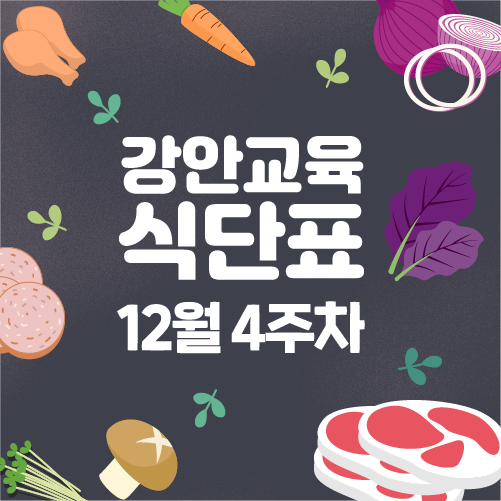 안녕하세요 강안교육입니다. 12월 22일 ~ 12월 28일 식단표입니다. <img src="https://blogthumb.pstatic.net/MjAyNTEyMjJfMjU3/MDAxNzY2MzYyODkyNTU1.p2VTvXNbHXgwt2hn7x5g_S40uVxbhwQ5Gibftj1dMYgg.O9ktZmIucpFVkdX5AoQdZ4Wp06sMGzXOtvO6HLSFxEAg.PNG/%BD%C4%B4%DC%C7%A5_%BD%E6%B3%D7%C0%CF%2812%BF%F9_4%C1%D6%C2%F7%29.png?type=s3" />