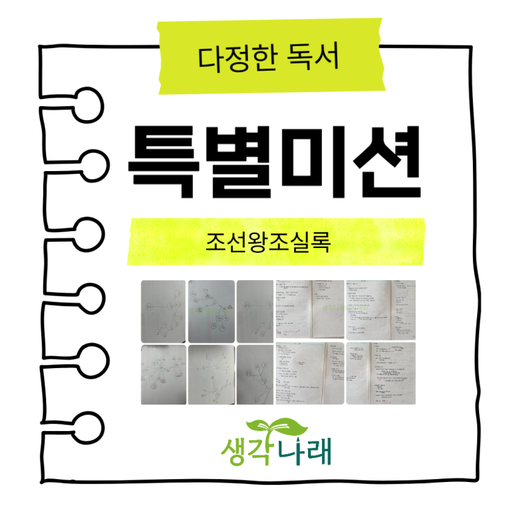 생각나래 영통 본원 중등 친구들은 다정한 독서로 조선왕조실록을 읽고 있습니다. 초등학생때부터 다정한 독서를 한 친구들은 방학이면 두꺼운 책을 읽고 글을 쓰는 것이 당연하게 여기고요. 이제는 '같이 해요~~~~'하지 않아도 어머님들께서 척척 다정한 독서를 신청하셔서 아이와 함께 읽고 글을 쓰고 계세요. 귀한 시간 어떻게 하면 더 도움이 될까? 어머님들께서 다정한 독서로 5000원 참가비를 주셨습니다. 아이들을 위해서 사용하겠다고 말씀을 드렸지요. 특별 미션이 왜 도움이 될까? 중2 친구들은 이제 본격적으로 내신의 세계로 들어갑니다. 그리고 역사를 배워요. 우리 책으로 읽고 스스로 정리하면서 자기주도학습을 익히는....... <img src="https://blogthumb.pstatic.net/MjAyNjAyMTBfMjY1/MDAxNzcwNjg1MjQzNjY0.mxfIw5dn3Uyz7nGOr4Y1-LNdQdYqjYZ0UCYWas8vlXkg.MWuU5Qr6gAwSYi1uV9ba2CVn_owaM6aBx9i7FbFJTtsg.PNG/%C1%A6%B8%F1%C0%BB_%C0%D4%B7%C2%C7%D8%C1%D6%BC%BC%BF%E4_-001_%2831%29.png?type=s3" />