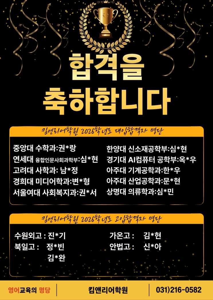 2026학년도 대입합격자,고입학격자 명단입니다. 모두 모두 축하합니다. <img src="https://blogthumb.pstatic.net/MjAyNjAyMTlfMjE2/MDAxNzcxNDg1NTUwMjY5.mBIGQSMuwSNk7V29X941QzCyys0agn9EJapd1TnSmx4g.NWgG0tp9CbTn8jNxZVbW0bCs58kUNNCz-WcOKnvR4KQg.JPEG/%C6%F7%BD%BA%C5%CD-001.jpg?type=s3" />