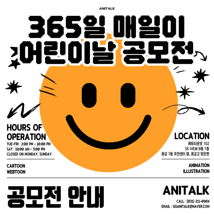 안녕하세요! 수원 애니 웹툰 일러스트 만화 전문 미술학원 광교 애니톡입니다! 오늘 소개해 드릴 내용은, 보건복지부와 아동권리보장원에서 주최하는 2026년 제2회 "365일 매일이 어린이날 그림 공모전" 이랍니다! 보건복지부 장관상과 우수상, 장려상, 아동 권리 보장 원장상을 수상하게 되며, 이번 작품들을 제104회 어린이날 기념 포스터로 활용될 예정이라고 합니다! 내가 그린 그림이 전국에 알려진다니,, 벌써부터 작가가 된 것 같은 그런 간접 체험 너무 재밌을 것 같지 않나요!? (김칫국) 공모 주제 공모 기간 2026.1.21(수) ~ 3.3(수) 참여 대상 국내에 거주하는 만 3세 이상 만 17세 이하의 아동 ※ 만 18세....... <img src="https://blogthumb.pstatic.net/MjAyNjAyMjFfODcg/MDAxNzcxNjQxMjUzMTE5.aEByS6G15WjiwpvroFW701jdrmH7qSiKKs5y58BexCwg.AIRnFZBL3VJyxOKYeRAA-D9qBSxWoalw98gTnNgGuswg.PNG/%EB%B8%94%EB%A1%9C%EA%B7%3F_%3F%8D%B8%3F%84%AC_%281%29.png?type=s3" />