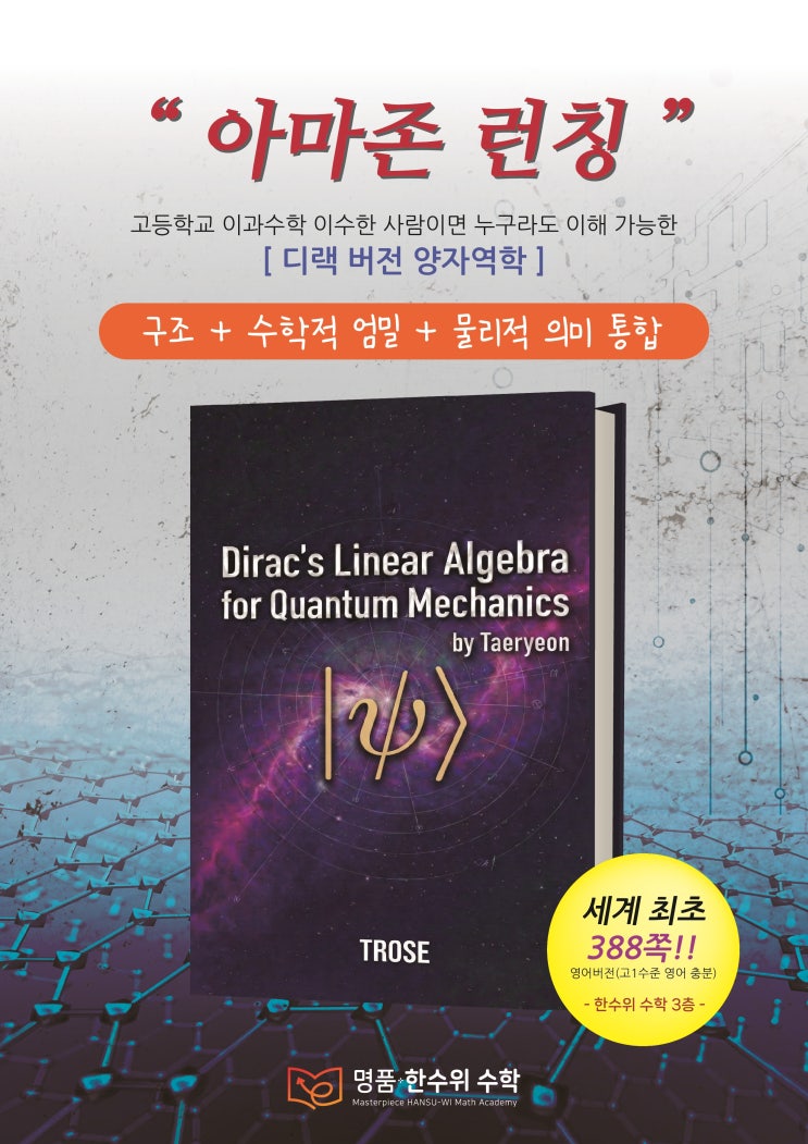 Amazon 정식 런칭!! Dirac's Linear Algebra for Quantum Mechanics https://www.amazon.com/dp/B0GPLHZH42 선형대수학을 통해 양자역학의 구조를 먼저 이해하고 그 위에서 파동함수와 미분방정식을 학습한다면 양자역학을 가장 자연스럽고 깊이 있게 이해할 수 있습니다. 구조와 수학적 엄밀성 그리고 물리적 의미를 하나로 연결한 디랙 방식의 양자역학 입문서 입니다. 대학 1학년 과정 Calculus 이수한 학생이라면 누구라도 충분히 이해 가능!! 양자역학을 배워 보세요~^^ <img src="https://blogthumb.pstatic.net/MjAyNjAzMDFfMTA3/MDAxNzcyMzQ5ODcyNDMx.FJjPe_N9PFNZprxt18MNSaJtE3vvg538Ko1TraXH0I4g.tWXDm1cAvAWU0vNxSa0-lJlplDqNogdmnDS90l8Ply4g.JPEG/1772349495644.jpg?type=s3" />