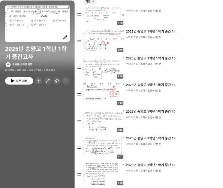 민락2지구에 위치한 수학 단과학원 '수학의기록' 입니다. [송양고 수학학원!] 영석고, 송현고에 이어서 송양고 [수학] 1학년 1학기 중간고사 기출문제 전문항을 꼼꼼하게 녹화하였습니다. 전문항을 하나하나 개별녹화하고 업로드 하여 학생들이 원하는 문제만 쉽고 빠르게 언제든지 시청할 수 있도록 하였습니다. [생각보다 오래 걸리다보니 시험기간이 아닐 때 미리미리 작업하고 있습니다..] 기출문제 풀이는 수학의기록 재원생에게만 별도 링크로 제공하고 있습니다. 송양고 2025년 1학년 1학기 중간고사는 객관식 16문항, 논술형 3문항으로 출제되었습니다. 1~7번 문항 교과서 기본 문제 수준으로 출제되었습니다. 8번~14번 문항 난....... <img src="https://blogthumb.pstatic.net/MjAyNjAzMDVfMjYw/MDAxNzcyNjU4NzAyNjgy.pyHH_wcqQO0FXiLQsjxmj064uCdPHYAClo7gQnYoYXEg.ZN69OiRueqNeM3gGp1wG8nxIvZVo1RT8RAj9D3f6_z4g.PNG/image.png?type=s3" />