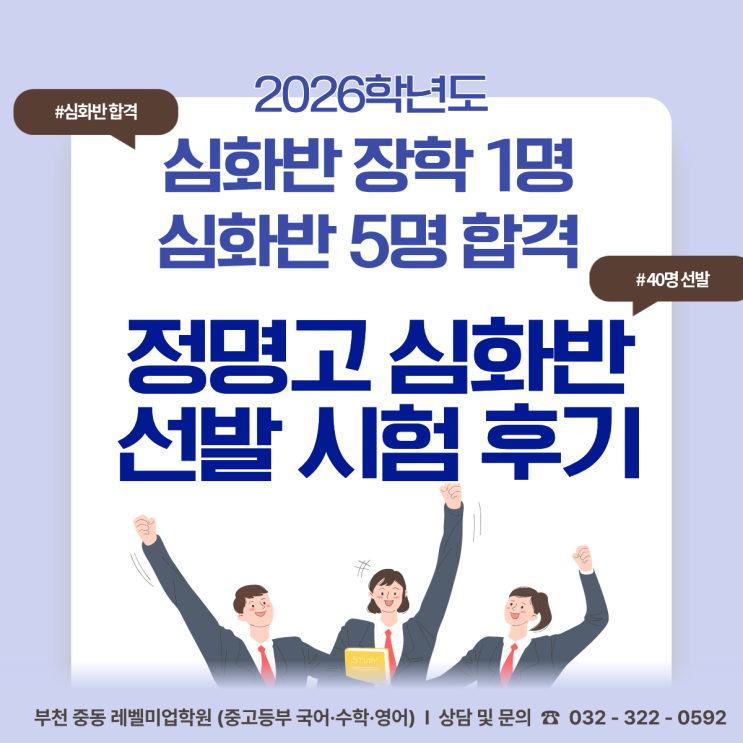 안녕하세요 레벨미업학원입니다. 많은 학생들이 궁금해하고, 질문이 많았던 정명고 심화반 선발시험! 지난 주 2/23(월) 시험 직후 2/24(화) 심화반 선발 학생들이 발표되었답니다 레벨미업학원에서 방학동안 열심히 공부해왔던 우리 친구들을 위해서 레벨미업학원에서도 선배들의 꿀팁이 담긴 출제 경향&대비 자료를 제공했었는데요 시험 결과, 재원생 중 5명 합격자 배출! 심화반 장학생 1명 배출!! 혹여나 선발고사 시험에서 아쉬운 결과가 있었더라도 심화반은 1학기 시험 종료 후 학교 시험 결과에 따라 변경이 있으니 너무 좌절하지는 않길 바랍니다^^ 정명고 심화반 선발시험이 궁금해!! 다음 시험이 궁금할 후배들을 위해 올해 시험 응....... <img src="https://blogthumb.pstatic.net/MjAyNjAzMDVfMjIy/MDAxNzcyNzA5NTMyOTkw.KIvN5kdpWN5jzCHzKdPKKYGj93YLP6xVPafcuOwpVxsg._tFfYJovl-wE9wrDvPvOXTu7Iv9TRXaTNy0bDkrUj8gg.PNG/1.png?type=s3" />