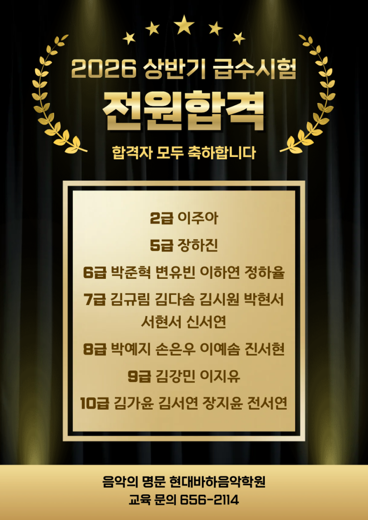 동삭동 음악학원 • 동삭동 피아노학원 | 2026 상반기 급수시험 전원합격
