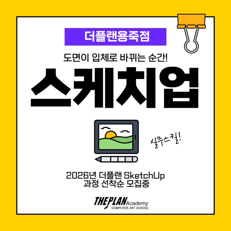 도면이 입체로 바뀌는 순간, 일이 달라집니다 안녕하세요! 더플랜컴퓨터학원 평택용죽점입니다. 인테리어, 건축, 3D 디자인에 관심은 있지만 어떤 프로그램부터 시작해야 할지 막막한 분들 많죠. 그럴 때 가장 먼저 선택되는 툴이 바로 스케치업 입니다. 오늘은 더플랜 용죽점에서 모집중인 스케치업 과정에 대해 설명드리도록 하겠습니다 스케치업은 왜 배워야 할까요? 스케치업 과정은 스케치업 프로그램을 이용하여 스케치, 제도, 캐드 등으로 작업한 2차원 도면을 3차원으로 모델링 브이레이, 루미온 프로그램을 이용하여 실사 느낌의 이미지를 만드는 과정입니다. 실무에서 약 40% 이상 사용되고 있는 스케치업은 건축, 인테리어, 토목, 조....... <img src="https://blogthumb.pstatic.net/MjAyNjA0MjlfMjc0/MDAxNzc3NDQ2NDEzNzUx.1wWVCmfSY4J59g4_oEA05XEO3-dSi1AEJUdndTJjq_0g.nupHGUm07RYv4htdDuR50PWn2rVFaIKHbPIUKIhFXWIg.PNG/image.png?type=s3" />