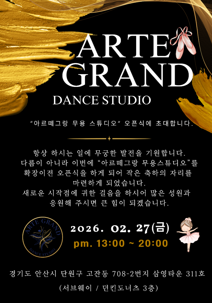 안녕하세요^^ 제가 보금자리 무용스튜디오를 8년만에 이전을 하게 되었습니다. 바쁘시더라도 잠시 들러 기쁨을 함께 나누어 주시면 감사하겠습니다. 아르떼그랑 무용 스튜디오 확장 이전 오픈식 ️날짜: 2월 27일 금요일 ️시간: 13:00 ~ 20:00 (편하신 시간에 방문해 주세요) ️위치: 고잔동 삼영타운 311호 (서브웨이&던킨도너츠 건물 3층) <img src="https://blogthumb.pstatic.net/MjAyNjAyMTlfMjE1/MDAxNzcxNDc3MzY5MzQw.i6RMiNP3agVeu1zhg0SphP3SljVwmNJv_4QHgAn5AAYg.2deRGmSlEmkqqb_vDPL-SeH8kxQCM01qmLxMwNt-E6Qg.PNG/900%A3%DF1771459321383.png?type=s3" />