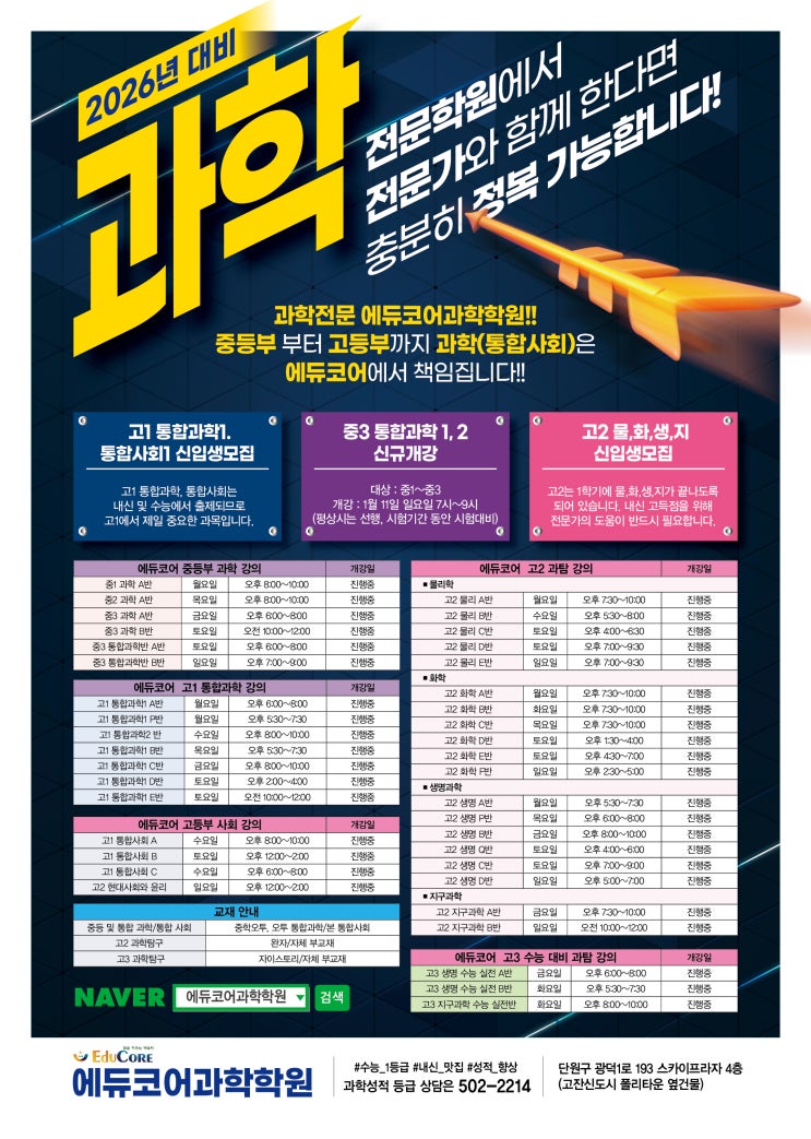 안녕하세요! 과학 성적의 기준, 에듀코어 과학학원입니다. 2026년을 대비하여 중등부 부터 고등부까지, 내신과 수능을 동시에 잡을 신입생을 모집합니다. 전문가와 함께라면 과학 정복, 어렵지 않습니다! 주요 모집 대상 및 특징 고1 통합과학 & 통합사회: 내신과 수능의 기초! 고1에서 가장 중요한 과목을 완벽 대비합니다. 중3 통합과학 1·2: 중1~3 대상 선행 및 시험 기간 밀착 관리 (1월 11일 개강). 고2 물·화·생·지: 1학기 내 과목 완성을 목표로 내신 고득점을 위한 심화 강의 진행. 고3 수능 실전: 수능 1등급을 위한 과탐 실전 대비반 운영. 이런 분들께 추천합니다! ✅ 과학 성적 기복이 심해 고민인 학생 ✅ 통합과학/통....... <img src="https://blogthumb.pstatic.net/MjAyNjAyMjNfMTEx/MDAxNzcxODE1NjcwMzIz.5jyD_59zRmif_2vpQ44CEVNFyXurjBAYGAb4oq3xuWAg.nkzncJfksGAiilNsAMXNCW-E2NrZlkYs3lrs-oPHUesg.JPEG/1771814783398.jpg?type=s3" />