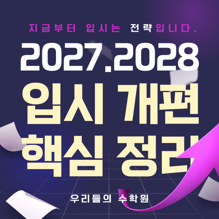 안녕하세요, 우리들의 수학원입니다. 최근 발표된 2027·2028학년도 입시 개편 방향을 보면 한 가지는 분명합니다. 입시는 더 이상 ‘단기간 성적 상승’으로 뒤집기 어려운 구조로 바뀌고 있습니다. 예전에는 “고3 때 몰아서” “중3 때 정신 차리고” 이런 전략이 통하는 경우도 있었지만, 이제는 구조 자체가 그렇게 설계되어 있지 않습니다. 학부모님들과 학생들이 반드시 알아야 할 핵심 변화, 그리고 그 의미를 조금 더 자세히 설명드리겠습니다. 1. 고등학교 입시: 중학교 전 과정 반영 기존에는 ✔️ 중2·중3 성적 중심 ✔️ 봉사활동 포함 ✔️ 출결 영향은 제한적 ➡️ 이렇게 변경되었습니다! ✔️ 중1 2학기부터 + 중2·중3 성적 반영....... <img src="https://blogthumb.pstatic.net/MjAyNjA0MjNfMjc4/MDAxNzc2OTI4ODI1NDUy.hfiwgEHdmLt0s5R4nQy84DUq3F-C2BuRjDOd1GBHRGsg.ByxuigmYzDt73n6khNXLfaIMkHU5hcv6OSosHkpssFsg.PNG/image.png?type=s3" />