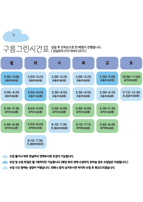 안녕하세요 :) 구름그린미술입니다~ 3월 새학기를 맞아 수업 시간표가 새롭게 변경되었습니다. 기존에는 ✔ 유치부 60분 ✔ 초등부 80분 으로 운영되었는데요, 이번 3월부터는 초등부 60분 수업이 새롭게 추가됩니다. 초등부 60분 신설 안내 저학년 친구들에게는 80분 수업이 조금 길게 느껴질 수 있어요. 그래서 ✔ 집중력을 유지하면서 ✔ 기초 표현력을 탄탄히 다지고 ✔ 부담 없이 미술을 즐길 수 있도록 초등 저학년 중심의 60분 클래스를 새롭게 구성했습니다. 기초 드로잉, 색채 표현, 만들기 수업 등 아이의 성향과 학년에 맞춰 차분히, 그리고 단단하게 쌓아가는 수업이 될 예정입니다. 3월 새학기 등록 이벤트 새롭게 등록해주시....... <img src="https://blogthumb.pstatic.net/MjAyNjAyMjJfMzEg/MDAxNzcxNzQ1MDcyODQ1.rQB6SqM-2ZBvNKKxEZ5Ev38aos-_1Dv91Pa_mH1rYl4g._sP2SGp0Bk39Vx8Dv8zm3_-Ufix5_GnfeKMIphC2Om0g.JPEG/%BD%C3%B0%A3%C7%A5_3%BF%F9-01.jpg?type=s3" />