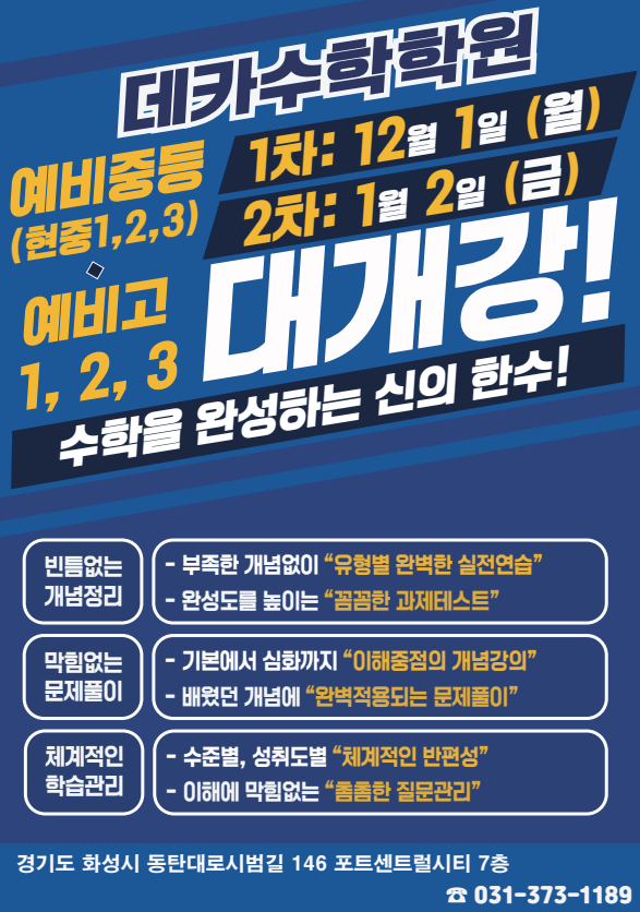 안녕하세요? 데카수학학원 입니다. 예비중등, 고등관의 일정이 확정 되었습니다. 1차 개강일: 12월 1일(월요일) 2차 개강일: 1월 2일(금요일) 입니다. 새로운 교육과정으로 각 학년마다 고민이 있음을 알고있습니다. 이러한 학부모님과 학생의 걱정에 데카수학이 답을 드립니다. 데카수학학원은 그동안 성적과 실적으로 증명해왔으며, 성적향상과 대입실적으로 학생의 성공을 함께하고 있습니다. 일부반은 마감이 될수도 있으니 빠른 레벨테스트 부탁드립니다. ☎ 031-373-1189 ※ 테스트방문전 반드시 연락바랍니다. <img src="https://blogthumb.pstatic.net/MjAyNTEyMTBfMjUg/MDAxNzY1MzUzMjgzNzQy.Zg2yTdcPqdnIrE9mpKapRuPSCqrIfs1gzTGzEN9_CAUg.6oF9jR5SA1upxJYhqBz1-Zl-J5dGvf4DDMPYtVzZVlUg.PNG/image.png?type=s3" />
