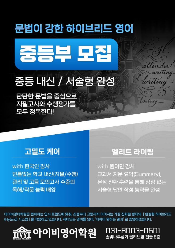 2028 대입, '쓰지 못하면' 1등급은 없습니다. 원어민의 표현력에 한국인의 분석력을 더한, '이기는 영어'의 완성 안녕하십니까, 아이비영어학원입니다. 교육 정책이 변하고 있습니다. 2028 대입 개편안과 고교 내신 5등급제 도입으로 인해, 이제 중고등학교 영어 시험은 단순 객관식 찍기가 아닌 '서술형·논술형 평가'가 당락을 결정합니다. "말은 유창하게 하는데, 막상 쓰라고 하면 문법이 다 틀리는 아이." 더 이상 이런 영어로는 상위권에 진입할 수 없습니다. 특히 내신 한 문제로 등급이 갈리는 고등학교에서는 더더욱 그렇습니다. 아이비영어학원은 변화하는 입시 트렌드에 맞춰, 초등부터 고등....... <img src="https://blogthumb.pstatic.net/MjAyNTEyMTZfMjcy/MDAxNzY1ODcwNTU3ODU0.fulPTqyVl5Qrz_7TeTzI-q9dskZQq278U6yBVnHY5wEg.V9KHUJV7AwgumajBCJZoZRo6jdlRABrQHr6QsKYKrucg.JPEG/2026%C1%DF%B5%EE%BA%CE%B8%F0%C1%FD_%282%29.jpg?type=s3" />