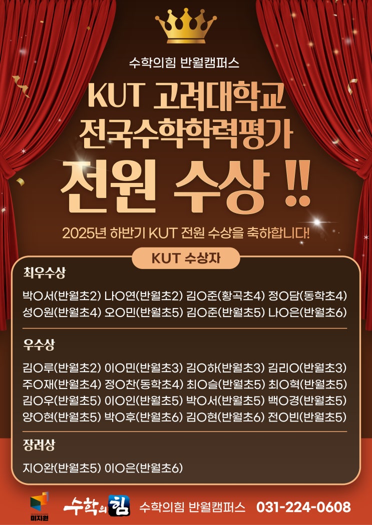 안녕하세요. 수학의힘 반월캠퍼스 입니다. 벌써 2025년이 얼마 남지 않았는데요~ 한 해 마무리를 잘 하고 계신가요~? 2025년은 수학의힘 학생들과 선생님들 모두 바쁘게 지냈던 한 해였던 것 같아요~ 오늘은 지난 11월 22일 시행했던 "2025년 하반기 KUT 고려대학교 전국수학학력평가" 에서 수학의힘 반월캠퍼스 학생들이 '전원 수상' 성과를 거두어서 기쁜 소식을 전하려고 합니다~*^^* 2025 하반기 KUT 고려대 전국수학학력평가에서 수상을 한 수학의 힘 반월캠퍼스 학생들 ! 축하해요~^^ 사진을 못 찍은 친구들도 있어서 아쉽지만 전원 수상을 다시 한번 축하합니다~! 10월부터 약 5주간의 시간동안 매주 주말마다 나와서....... <img src="https://blogthumb.pstatic.net/MjAyNTEyMjBfMTM2/MDAxNzY2MTk3ODE3Nzg2.7dzUNPfQhk-z-OrxMACO_TjkccDEt9iDYY8bq4aomk8g.U-02nWgsUxozF_9AOqs7bMa9DvWluL-CuO84YzIR-3Ag.JPEG/%BC%F6%BB%F3%C0%DA%B8%ED%B4%DC.jpg?type=s3" />