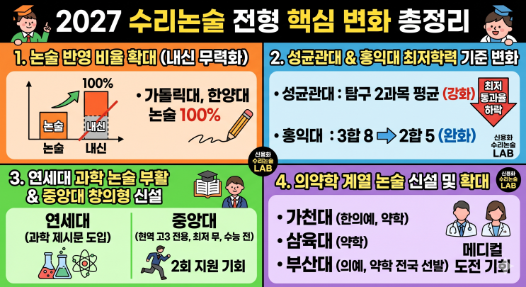 2027학년도 수리논술은 '논술 비중 강화'와 '수능 최저의 변화'가 가장 큰 특징입니다. 주요 변경 사항을 5가지 포인트로 정리했습니다. 1. "논술이 전부다!" 논술 반영 비율 확대 학생부 교과(내신)의 영향력이 사실상 사라지고 있습니다. 이제는 수학 실력만으로 승부를 볼 수 있는 학교가 늘었습니다. 논술 100% 선발: 가톨릭대(일반과), 한양대 등이 내신 반영을 전면 폐지하고 논술 성적만으로 선발합니다. 반영 비율 상향: 단국대(90%), 세종대(80%), 숭실대(90%), 인하대(80%) 등 대다수 주요 대학이 논술 비중을 10% 이상 상향 조정했습니다. 2. 성균관대 & 홍익대 수능 최저 기준 변화 성균관대 (강....... <img src="https://blogthumb.pstatic.net/MjAyNjA0MjhfMjQ2/MDAxNzc3MzQ5Mjg4MTM0.LZ9H24fv_JihQDkrITKu0bPkp4Up7D8YwesArq9aLgsg._-0XqN7yzf2YaPYkp0pmc3hinctNl7gpHr4BnZdXO4gg.PNG/Gemini_Generated_Image_ny9xwny9xwny9xwn.png?type=s3" />