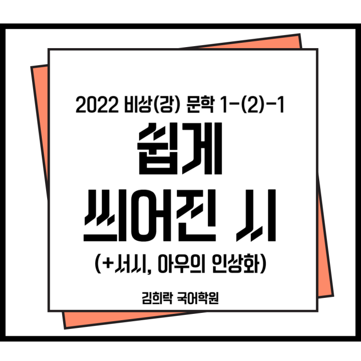 굿모닝! 좀 늦나? 어쨌든 김희락 국어학원입니다! 안녕! 오늘의 작품 분석은 바로 '쉽게 씌어진 시'입니다! 와! 윤동주! 윤동주 아시는구나!! 진짜 겁.나.잘.씁.니.다. 쉽게 썼다고 하는데 절대 안 쉽게 쓴 것 같은 이 작품! 이게 쉽게 쓴 거면 전 아마 짚신벌레쯤 되지 않을까요 ㅋㅋㅋ 아무튼 모의고사와 내신에서 아주 스테디하게 나오는 이 작품! 안 쉽게 씌어진 시! 그럼 한번 분석! 가볼깝쇼!!!! 쉽게 씌어진 시 작품 개관 및 분석 1. 핵심 정리 - 「쉽게 씌어진 시」 2. 「쉽게 씌어진 시」의 전체 구성 3. 시구의 반복과 변주 4. 상징적 시어의 대립 5. 시어의 상징적 의미 6. 자아의 이중성 7. 시적 화자의 정서 및 태도의 변....... <img src="https://blogthumb.pstatic.net/MjAyNjAzMTZfMjY0/MDAxNzczNTk1MDIxMTEz.FVvQwwUlLhDm4cgEGW5W9ZyEWVVzUkfPPuEH_AQkMgwg.v6wS384enZAHmHe3n1asZAVeFzx_g8-E7PJECqYs-zUg.PNG/%C1%A6%B8%F1%C0%BB_%C0%D4%B7%C2%C7%D8%C1%D6%BC%BC%BF%E4_-001_%282%29.png?type=s3" />